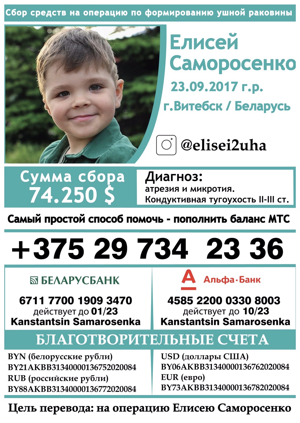 Просим вас оказать помощь в нашем сборе на второй этап лечения по восстановлению органа слуха. Будем благодарны за любую материальную и / или информационную поддержку.