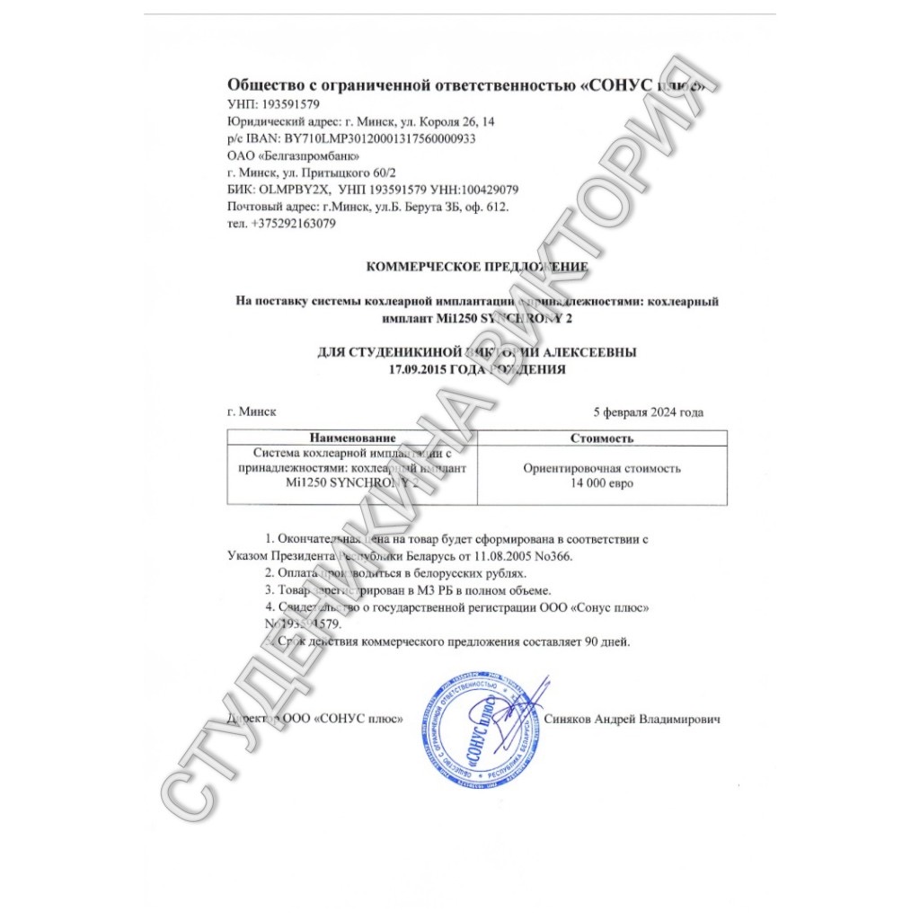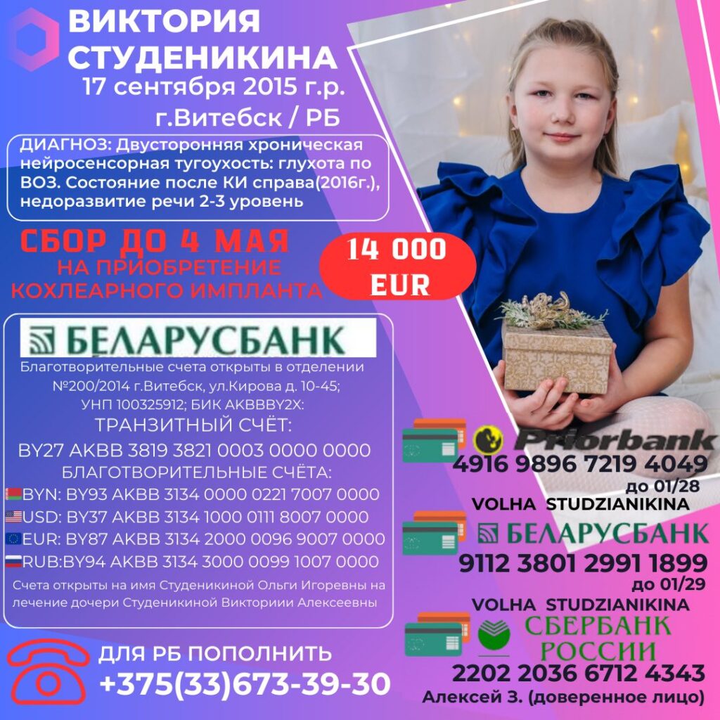 Как и любой родитель, я хочу сделать жизнь своего ребёнка максимально полноценной и комфортной. Стоимость импланта на левое ушко большая – около 14000 евро. Мы просим Вас оказать посильную помощь в приобретении кохлеарной системы для нашей доченьки.